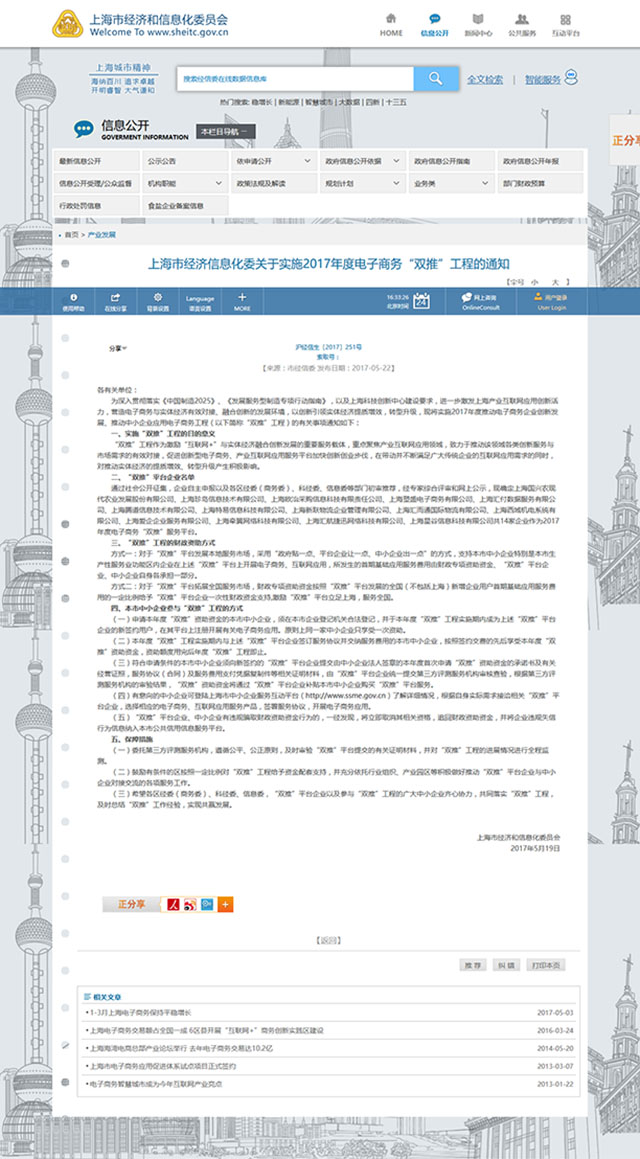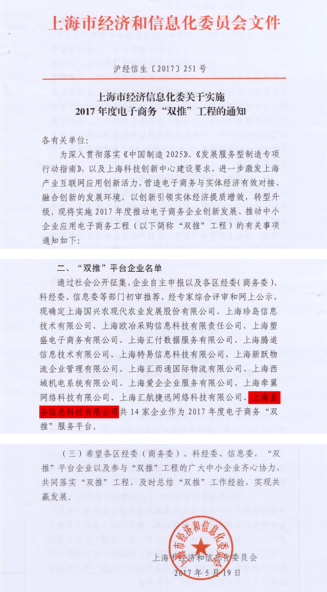 5月22日,上海市经济信息化委关于实施2017年度电子商务“双推”工程的通知正式发布。热烈祝贺包括上海星谷信息科技有限公司、上海国兴农现代农业发展股份有限公司、上海欧冶采购信息科技有限责任公司、上海塑盛电子商务有限公司等在内的14家优秀企业,被评选为2017年电子商务“双推”服务企业。