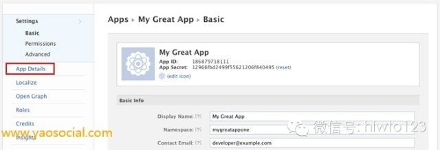 访问Facebook开发者页面,创建你的APP,然后来到APP Dashboard,点击左侧导航的App Detail。
