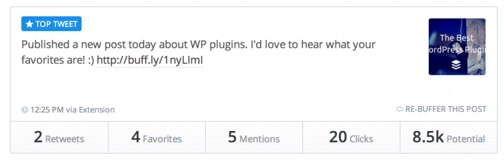 那么你该如何知道呢?最好的办法,就是利用报表工具,而且绝大多数主流社交网络在他们的网站里都有一些基本的分析功能。这些工具可以告诉你发布的内容取得了哪些成效,比如访问量,点击率,转发分享量,点赞量,还有评论数等等,笔者自己使用的是Buffer分析工具。实际上,分析是非常重要的,在经过这一流程之后,我们才能进入测试和迭代。