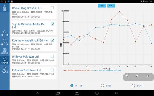 点开左侧栏的“公司对比”,同时出现了好几家公司,小编随便点了几家(目前最多只能支持3家公司同步对比),在右侧出现了一个曲线变化表格,里面的对比维度是:数量、重量、目标国、单价、进出口港口等进行多公司、多维度数据的比较(如图5所示)。