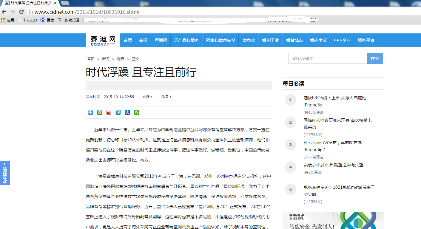 上个月,星谷在北京工业互联网大会上荣获两项大奖,一举成名,各大媒体纷纷前来专访,除了《进出口经理人》杂志的专题采访外,工信部赛迪网也向星谷约稿。10月14日,赛迪网在该网的“商界”新闻里发布了一篇名为《时代浮躁 且专注且前行》的文章,介绍星谷服务和星谷精神,乃至星谷受到的各界认可也被提及在内。