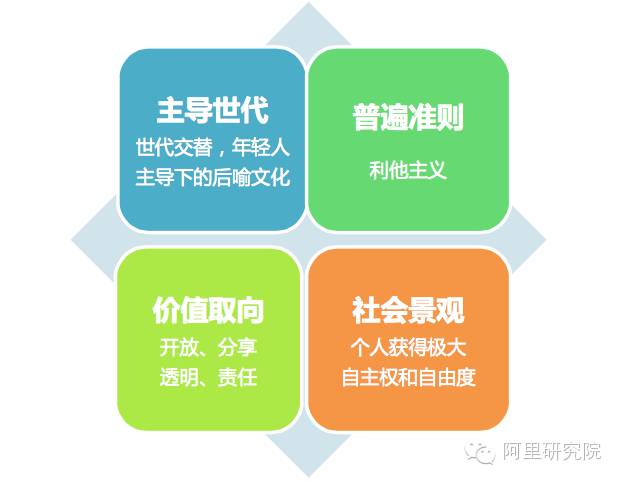 文化篇:DT时代将引致社会生活和文化领域的一系列变化,迎来全新的商业文明。表现为:“后喻文化”(由年轻人所主导的文化)盛行;“利他主义”成为大规模现实(普遍准则);开放、分享、透明、责任(价值取向);个人获得极大自主权和自由度(社会景观)。