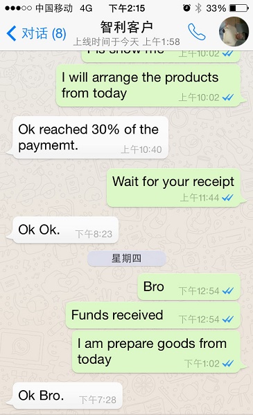 智利人还真的很守时,早上8点58分,她准时打来了电话。一口气跟我列出了8个问题,我一边听,一边重复确认,并做着笔记。她的问题完毕,我就开始一个接着一个的来回答他的问题。她听懂了,就直接翻译给老头听。整整通话1个半小时,彼此都聊得很开心,直到现在,我感觉是“一锤定音”的时候了。我问对方,问题都清楚了吗?她回答“yes”,我紧接着,告诉对方,你们有没有Skype?他们说:“我们都是很笨的老人了,不会弄这个,等孩子回来之后,让他们安装”。接着问我:“为什么要Skype呢?” 我说:“为了尽快让老头放心,我打算用Skype跟您和老头做一个Skype video call”,一来让你们了解一下我们的工厂和产品,二来可以让你们放心的跟我做生意,打消他的疑虑。对方回答:“my god ,小甜心,你真是太贴心了”。我们再次约定好,第二天上午skype 视频直播。