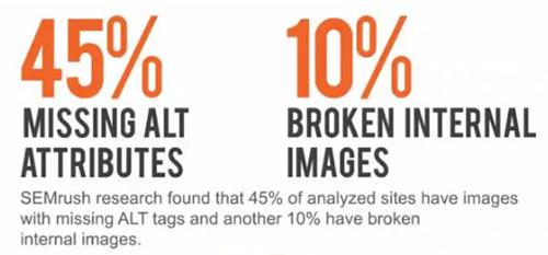 研究数据显示:45%的网站存在站内图片缺失ALT标签现象;10%的网站有站内图片失效的问题。